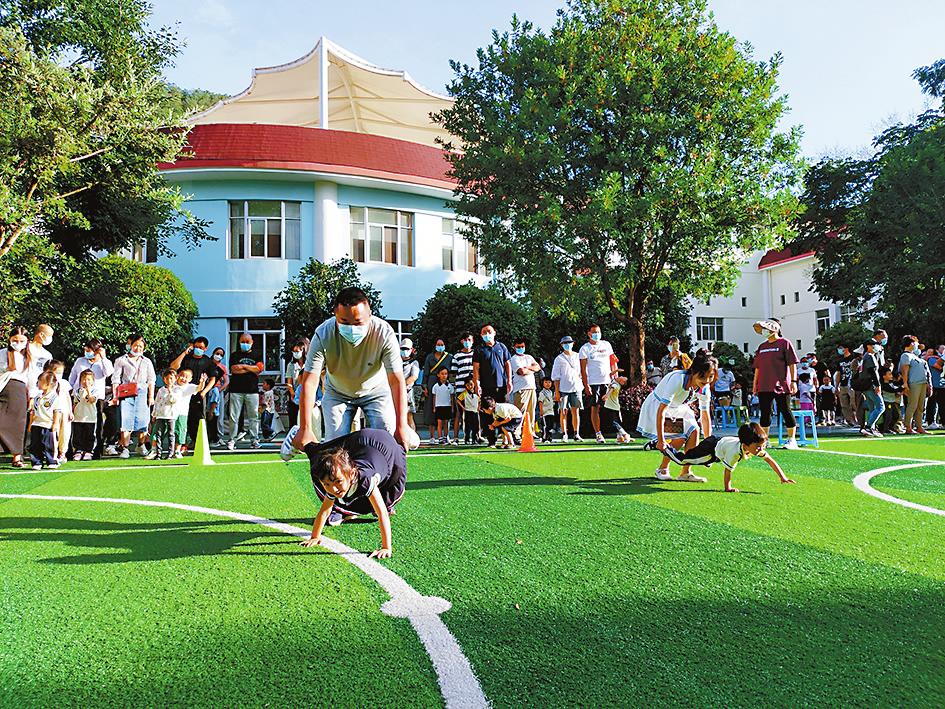 6月27日至28日,通海县第一幼儿园开展“童心追梦记 亲子嘉年华”游园活动,通过丰富多彩、新奇有趣的体验活动,不断丰富儿童的精神文化生活,营造爱护儿童、关心儿童健康成长的良好氛围。图为孩子和家长一起玩“推小车”游戏。 本报记者 曾梦琪 摄