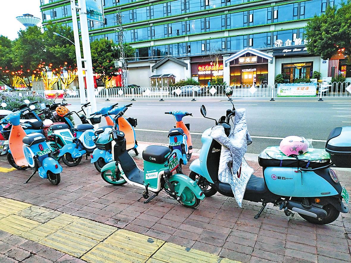暑假期间,在玉溪中心城区红塔大道青花街一带,有游客没有将电动车停放到指定的区域内,影响行人通行。 本报记者 摄