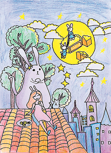 点评:小作者想象力丰富,有一定绘画功底,结合“中秋节”主题选材,使得作品层次丰富,笔法细腻,用色清新淡雅,给人悠闲舒适、轻松惬意之感,颇有意境。