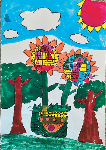 点评:小作者想象力丰富、大胆,让画中有花,花中有画。整幅作品结构紧凑,色彩鲜艳,给人昂扬向上、充满活力之感。