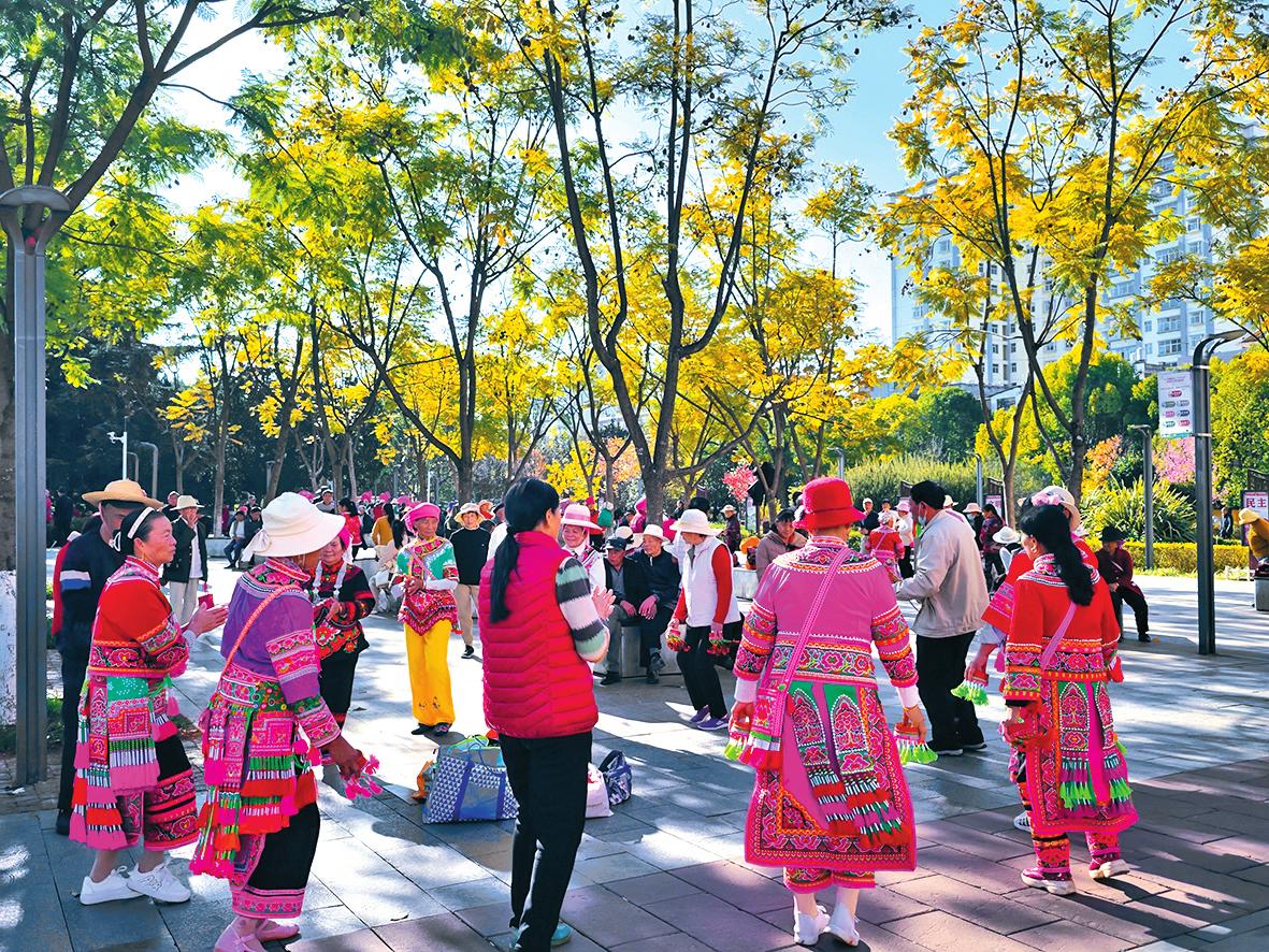 1月1日,玉溪中心城区聂耳公园热闹非凡,很多市民在公园里散步、遛娃、拍照,享受假期悠闲时光。记者在现场看到,有游客换上精美的服饰在空地上跳起舞蹈,为了不影响其他人,他们自弹自唱,自觉降低音量,积极践行文明风尚,成为公园里一道亮丽的风景。 本报记者 汤思琪 摄