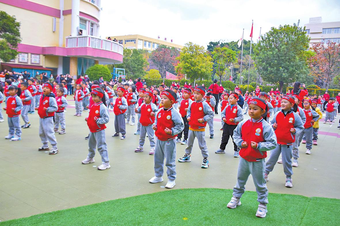 2023年12月27日,玉溪市第一幼儿园(文化园区)举行2023年“奔跑吧·少年”幼儿主题健身活动。活动现场,大班的幼儿和家长积极参与,进行了团体操、综合接力赛、“抬小猪”等比赛。此次活动既提高了幼儿的运动技能,培养了幼儿良好的身体素质,也促进了家园之间的交流,践行了家园共育理念。图为团体操比赛现场。 本报记者 黄思敏 摄