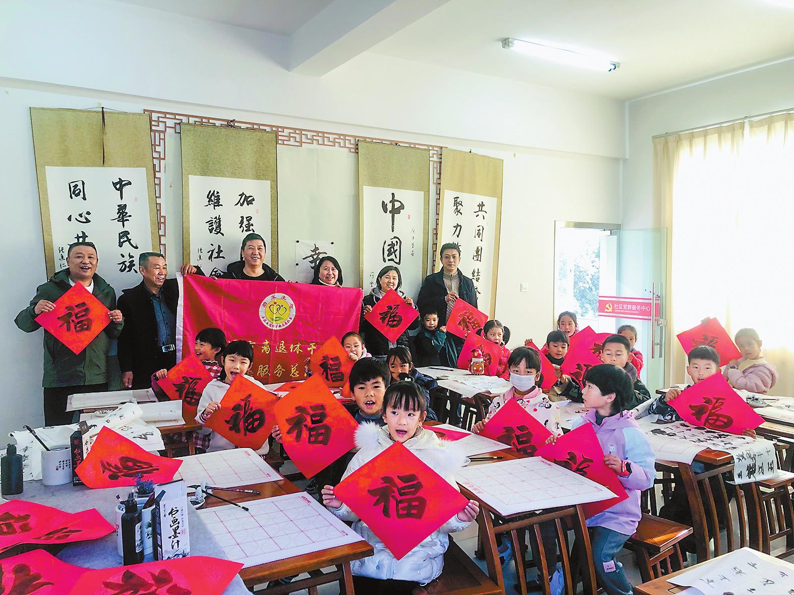 1月19日上午,红塔区凤凰街道高龙潭社区联合市老干部活动中心、市老干部诗书画协会,共同开展“我们的节日·春节”——“老少同书迎新春、福进万家送祝福”主题活动。38名孩子在书法老师的指导下提笔挥毫,将一个个带着墨香的“福”字写在纸上,让满满的祝福承载其间,既弘扬了中华优秀传统文化,又激发了青少年对书法的兴趣。 通讯员 许超 摄