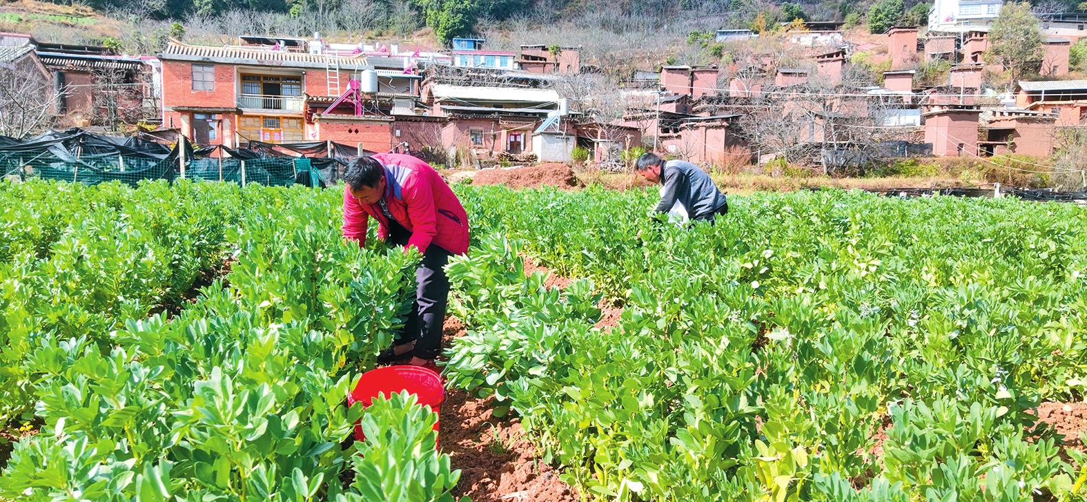 1月17日正午时分,在新平县新化乡新甸村,烟后种植的成片豌豆和蚕豆成熟,农户普忠云和工人一起在自家地里采摘蚕豆。据新甸村党总支副书记王丽萍介绍,去年秋冬季,该村2400亩烟后土地全部种上了蔬菜,其中种植豌豆1600亩,其余800亩种植蚕豆和青菜,今年全村烟后蔬菜总产值预计达960万元,高寒山区烟后蔬菜产业发展效益逐渐显现。