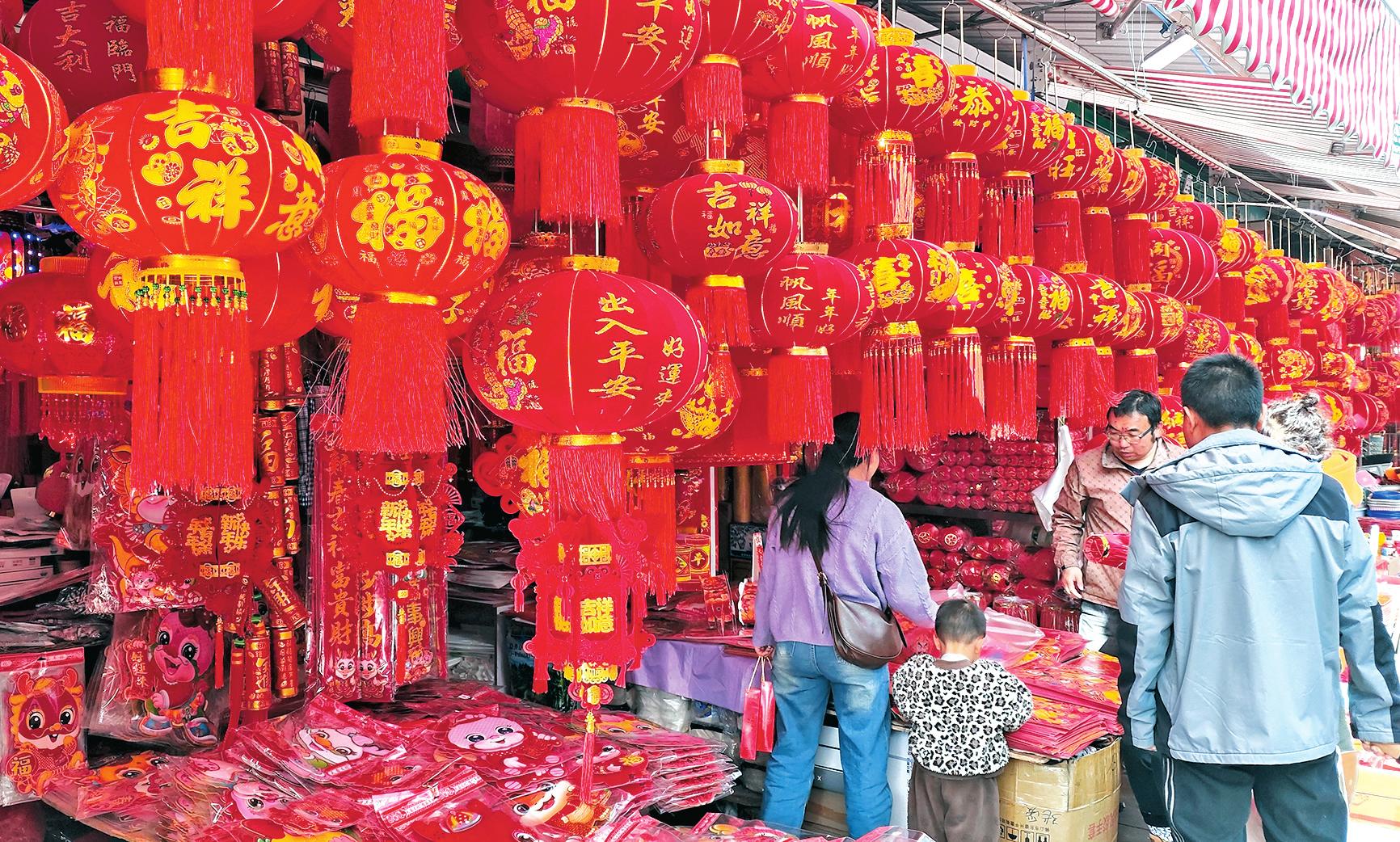 1月19日,位于玉溪中心城区的彩虹批发市场,商家在出售红灯笼、春联等年货,前来采购年货的顾客络绎不绝。随着春节日益临近,热闹的年货市场洋溢着浓浓的年味。