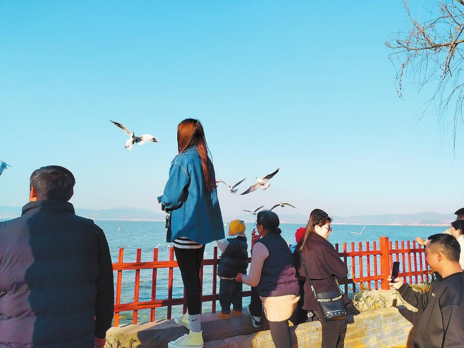 寒假期间,不少市民到通海杞麓湖畔游玩,购买面包投喂海鸥。记者看到,部分游客攀爬湖边的花台投喂海鸥,虽然有工作人员进行劝阻,但是仍有游客不听劝阻。 本报记者 摄