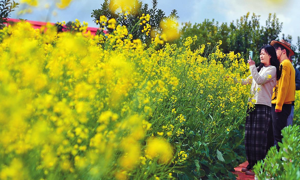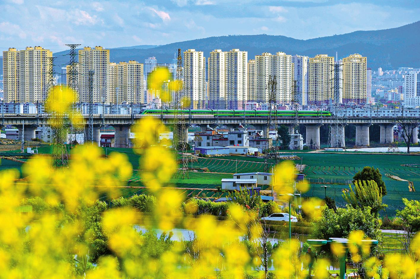 近日,红塔区活发小镇的油菜花绽放,引来游人在花田里赏花拍照。同时,从花田向远处眺望,中老铁路上的“复兴号”列车飞驰而过,好似一趟开往春天的列车,来自全国各地的游客从列车上就能感受玉溪的城乡之美、生态之美。
