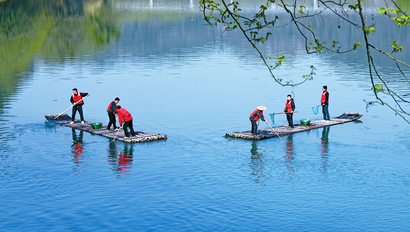 3月20日,浙江省台州市仙居县步路乡党员志愿者与河长一起在永安溪巡河护水,清理杂物垃圾。