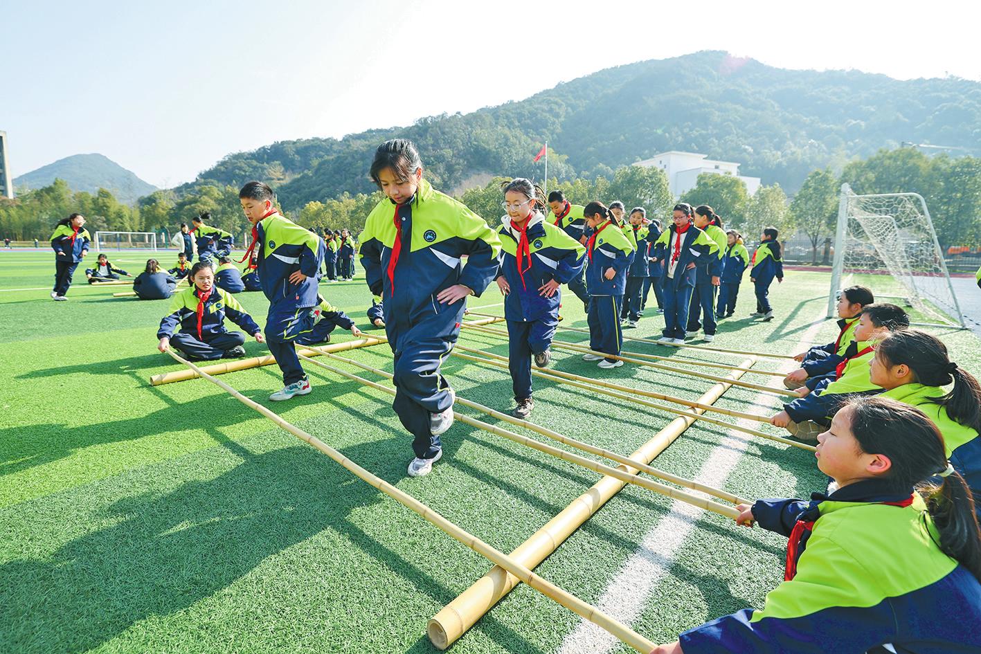 3月21日,浙江省湖州市德清县莫干山镇中心学校的学生在跳竹竿舞。