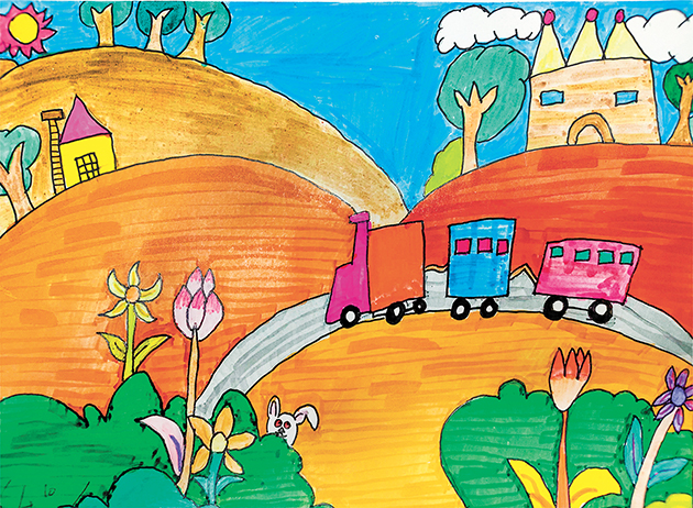 点评:红日、鲜花、绿树、蓝天、火车……小作者抓住春天的特点大胆下笔。作品构图完整清晰,画面干净简洁,色调和谐。弧线的合理使用,使得作品动静结合,活泼灵动。