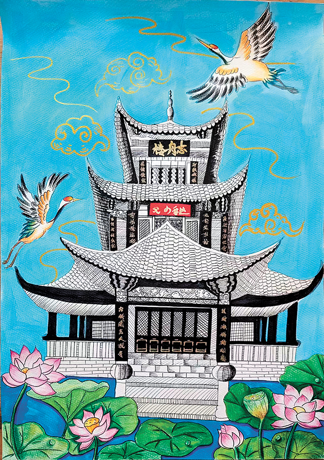 点评:小作者观察仔细,运笔大胆流畅,配色自然协调。仙鹤、莲池等元素的加入,不仅让作品凸显出志舟楼的特色,还使得画面更加丰富和生动。