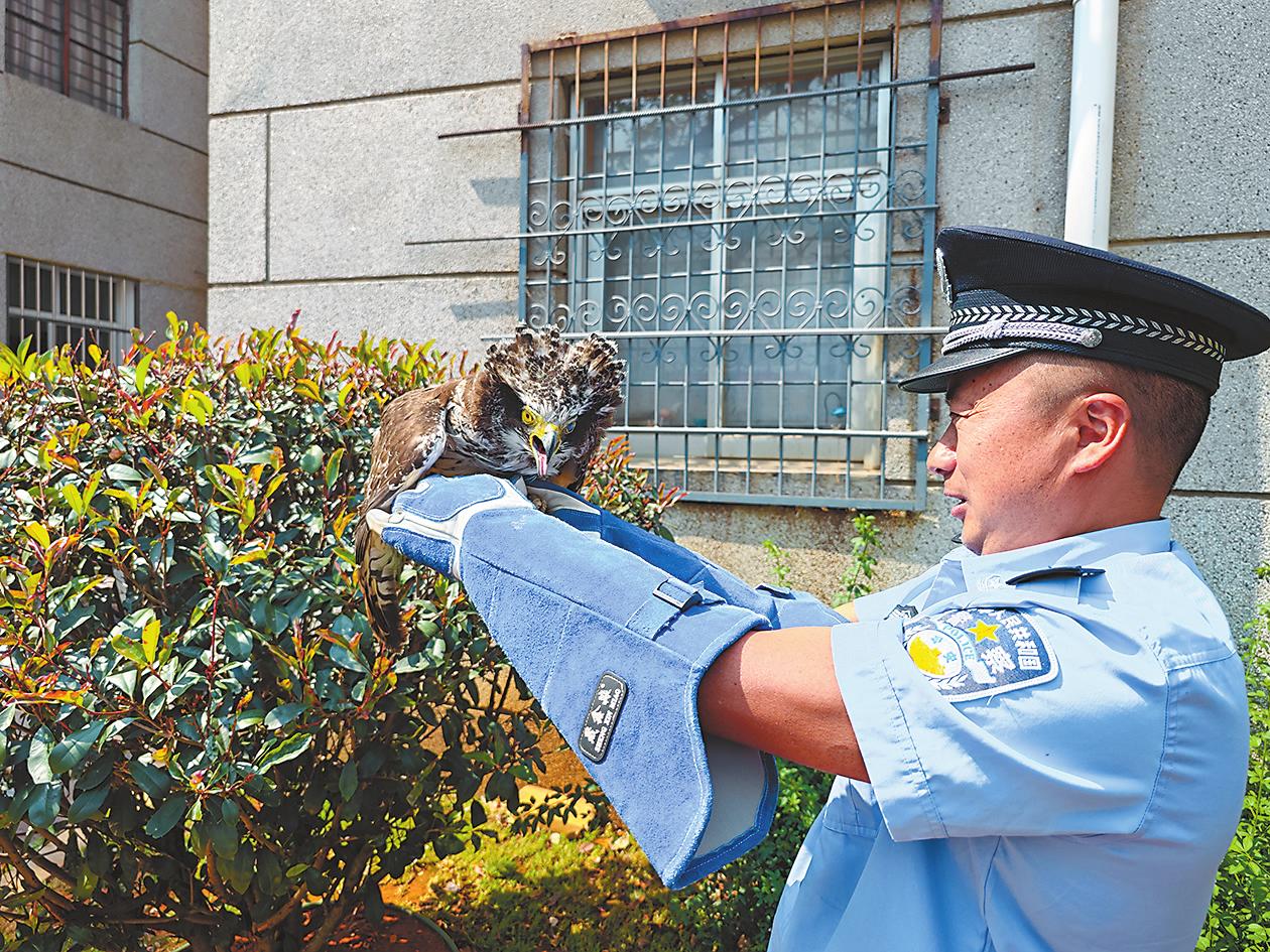 本报讯(通讯员 卿青 文/图)近日,玉溪市公安局江川分局江城派出所民警救助了一只国家二级重点保护野生动物蛇雕。 4月26日上午,江城派出所接到群众报警称,在江城镇侯家沟村长里冲小组发现一只老鹰。 民警迅速赶到现场,发现一只成年老鹰趴在地上一动不动。老鹰长着锋利的爪子和喙,双翼展开长达80多厘米,但看上去身体比较虚弱,精神萎靡不振。民警将老鹰带回派出所,找来鲜肉给它食用,但它对食物毫无兴趣。经进一步检查,发现老鹰的喙和眼睛都有伤痕,估计是与同类打斗所致。经查询比对,民警发现这不是一只普通的老鹰,而是国家二级重点保护野生动物蛇雕,是一种大型猛禽。 民警立即带蛇雕去兽医站,兽医为蛇雕进行了体检,并找来药物对其进行专业治疗。在民警的悉心照料下,蛇雕渐渐恢复活力,后民警将蛇雕移交江川区林业和草原局照管,待其具备野外生存能力时再放归大自然。 |