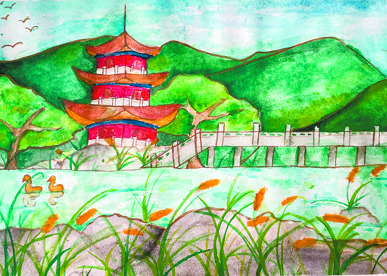 点评:从远处的山峦、飞鸟,到中间的古楼、溪湖,再到近处的芦苇、游鸭,小作者将各种元素合理布局,再用流畅的线条仔细勾勒,不仅使得画面内容丰富,还很有层次感。图画亮眼,文字优美,整体灵动自然,颇有美感。
