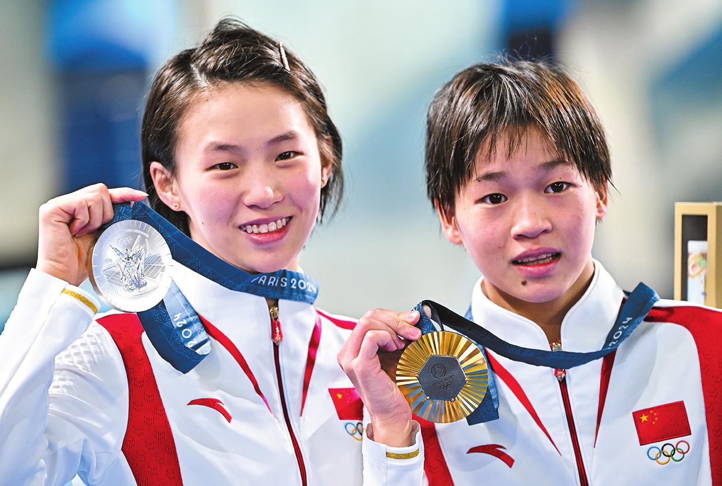 8月6日,全红婵(右)和陈芋汐展示奖牌。当日,在巴黎奥运会跳水项目女子10米跳台决赛中,中国选手全红婵获得金牌,另一名中国选手陈芋汐获得银牌。