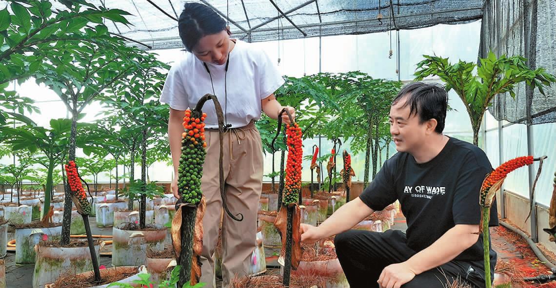 围绕如何种好魔芋,科技特派团还在新平县开展了一系列的品种、肥料和病虫害防治试验:在古城街道白家寨5亩核桃林下,开展8个魔芋引进品种的种植试验;在平甸乡费贾村蚂蟥箐开展百亩核桃林下魔芋标准化种植试验;在古城街道白家寨和水塘镇旧哈村开展10亩“魔芋—滇黄精”轮作种植试验;另外,依托玉溪市林业和草原科学研究院试验基地,对收集种植的40余个魔芋种质资源开展生物学鉴定,选育优良品种。