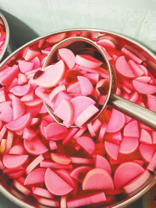 老醋泡出新味道 普玉华告诉记者,掌握制醋技艺后,她就在华宁的多家超市卖凉米线,每天生意还不错。疫情期间,超市生意不好,自己的凉米线专柜也撤了,后来才到西门农贸市场租店做起了小生意。那段时间,小店生意也不好,她就在家尝试用玫瑰花泡醋,结果口感还不错。于是,她从昆明安宁购买了200公斤玫瑰花,并将这些花全部做成玫瑰醋。刚开始的几个月,玫瑰醋的销售还不错,可时间一长,玫瑰颜色就开始发黑。后来,普玉华发现玫瑰醋不能一次做太多,每次都要选用新鲜的玫瑰,做出来的玫瑰醋色泽才鲜红、味道才纯正。 “有酸汤萝卜卖吗?给我称两斤……”在普玉华接受记者采访期间,上门购买酸汤萝卜的顾客络绎不绝,有90多岁的老人,也有年轻人。现在,泡酸汤萝卜成了普玉华店里的“销量之冠”。 谈起为何从卖醋到卖酸汤萝卜?普玉华笑着说,这还要源于“舍得”二字。原来,疫情期间,由于生意不好,普玉华把自己制作的醋送给经常光顾小店的客人。一天,一位老顾客路过小店,随口说了一句:“用你的醋来泡萝卜,味道还不错。”说者无心,听者有意。普玉华便开始尝试用自己酿的老醋来泡萝卜,没想到却因此打开了销路。现在,普玉华每隔四五天就要泡一次酸汤萝卜,每次泡200公斤,一个月仅酸汤萝卜的销量就达1吨左右,华宁县城、盘溪、华溪、昆明等地有近10位销售商都从她这里批发酸汤萝卜。 “做食品就是做良心。我制作的食品无任何添加剂和防腐剂,每次都是自己先品尝,没有问题才会卖给顾客。”普玉华介绍说。除零售和批发外,她还学习拍摄抖音视频。越来越多的人通过抖音认识了华宁“老味醋”,用“老味醋”制作的玫瑰醋、酸汤萝卜已远销全国各地,提升了华宁的知名度。