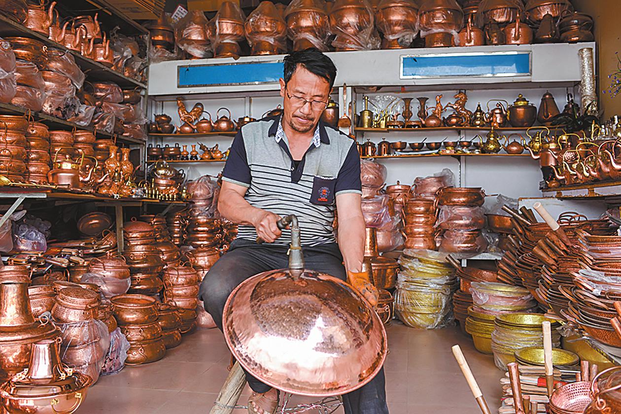 炊锅工艺源远流长 在江川区这片土地上,炊锅菜不仅是一道美食,更是一种文化的传承。早在战国时期,江川先民已能娴熟掌握铜器的铸造和加工,铜器使用极为广泛。在世代繁衍和传承中,人们逐渐将制铜工艺融入生活器具制作,使其兼具实用性与艺术价值,而炊锅便是这一传统的延续。 这种黄灿灿的铜炊锅,是江川制铜匠人用小锤经无数次敲打制作而成的。它的锅体环绕炉体,炉体则从锅体中间穿过,设计精巧,工艺精湛。其独特的结构不仅保证了火力均匀分布,更能让锅中的食材与汤汁在沸腾中充分交融。食材在吸收汤汁精华的同时,也释放出浓郁的香气,每一口,都蕴含着江川独有的风味。 据相关文献记述,旧时江川渔村、新河咀一带的工匠,已经掌握生产炊锅的技术,但因技术落后,靠敲敲打打的手工操作,产量很少。 进入二十世纪七八十年代,江川铝制品厂、新河咀炊锅厂和赵官铜器厂开始分别生产铝合金和铜制火锅。其中,铝制品厂主要生产机制铝合金火锅。为提高产品质量,厂家改进了生产技术,并设计、制造了“雪花牌”“云湖牌”“宫廷牌”火锅、三节蒸锅和三用铝合金火锅。三用铝合金火锅可以拆装、互换,一锅多用,能用炭或煤油做燃料,又能用电,使用方便,具有硬度高、耐磨性好、抗腐蚀性强的特点,成为当时的一种新型炊具,远销国内12个省市。 与此同时,新河咀和赵官生产的铜制火锅,作为江川的传统产品,也得到了进一步的发展。为了发挥这些名特产品的优势,江川工匠对生产技术进行改进,生产出了大、中、小不同尺寸的火锅。当时,新河咀炊锅厂的年产量达到了1100多件,产品不仅在省内,在省外也广受欢迎。赵官铜器厂则与邻县通海的工厂合作,年加工生产火锅500多件。 或许是江川人对铜制器物的偏爱,铜火锅在江川人心中占据着特殊地位。在其产量和工艺不断提升的同时,铜制火锅几乎成了江川人节假日家人团聚、宴请亲朋好友最常见的炊具。甚至很多人家会购置一口或几口大小不等的铜火锅,用于日常烹饪款待亲朋。