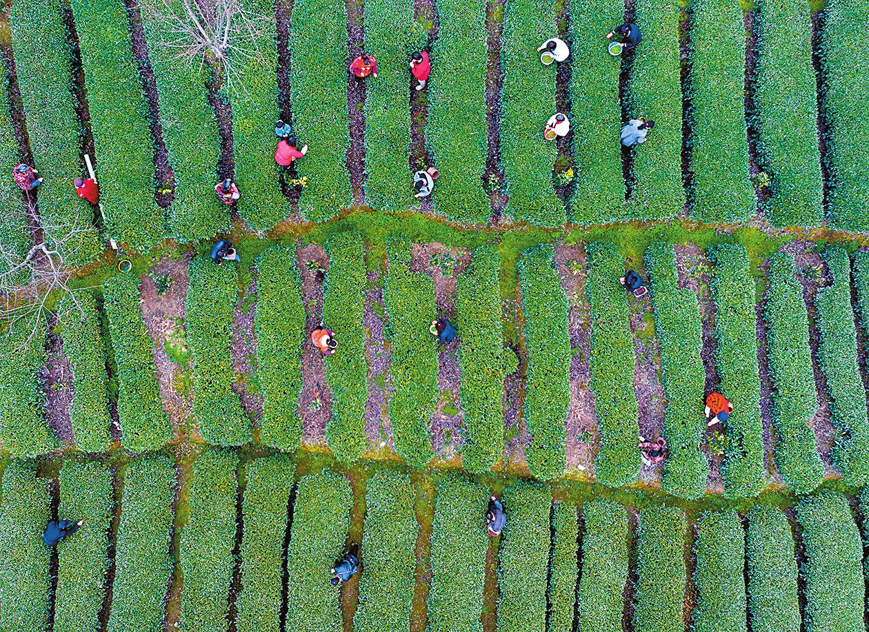 2月25日,茶农在秭归县茅坪镇中坝子村茶园采摘早春茶(无人机照片)。