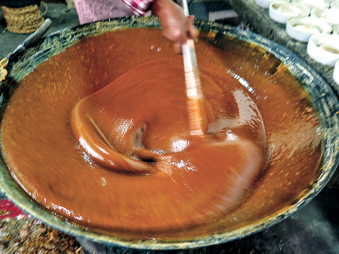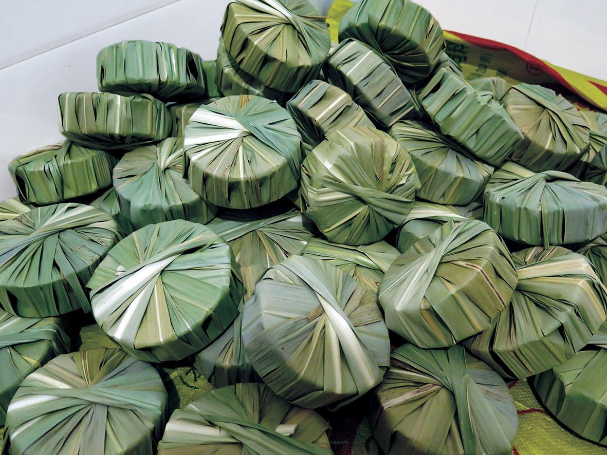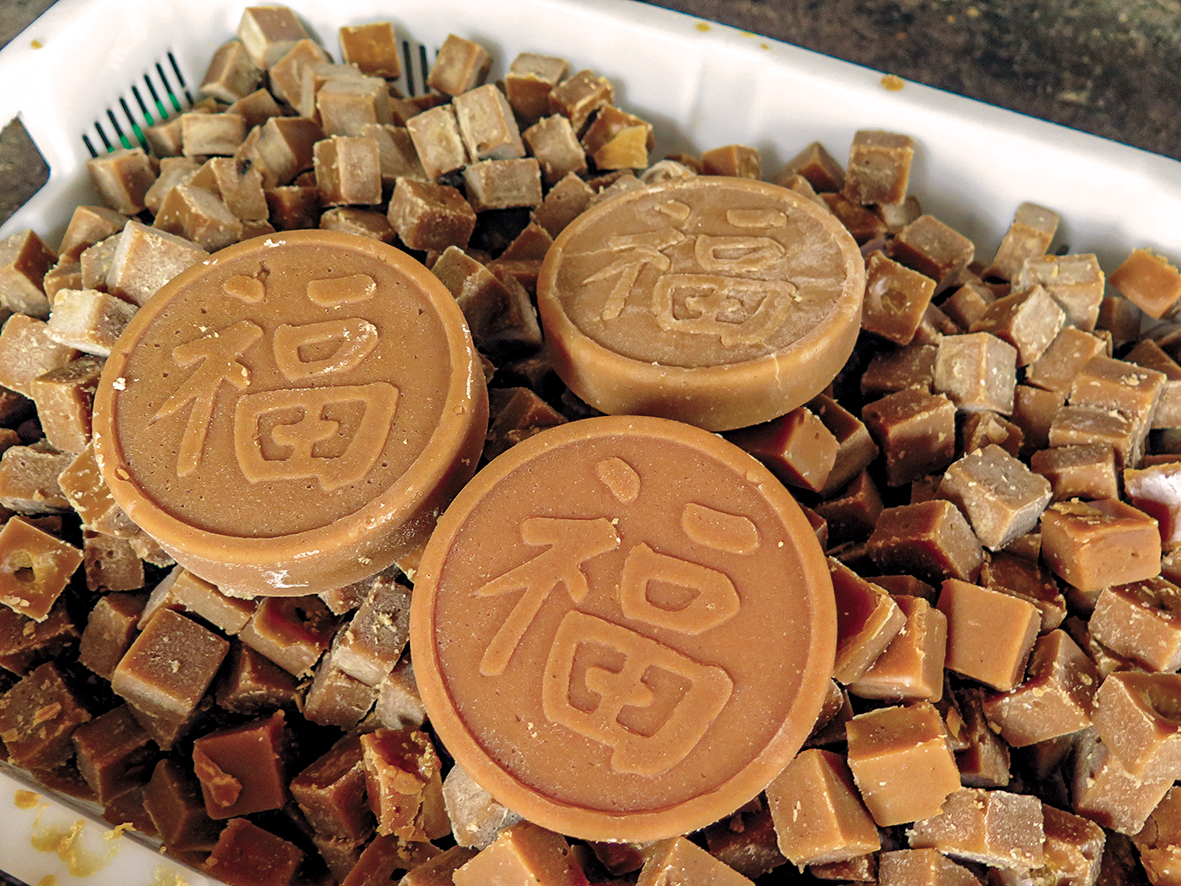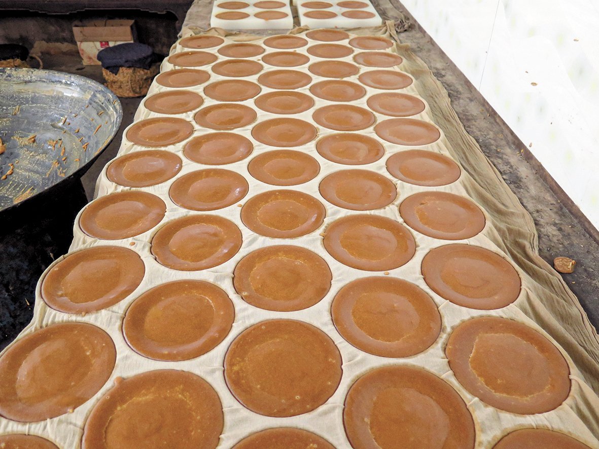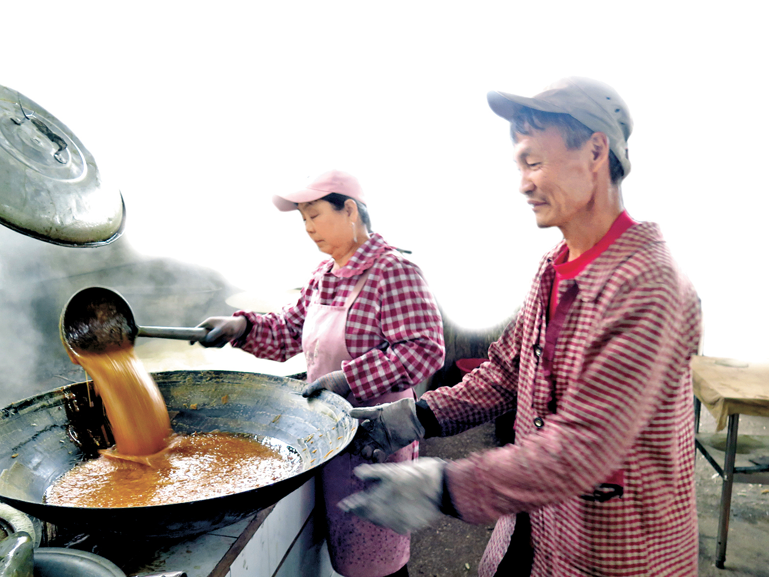 制糖是技术活,更是体力活 在弥漫着糖香的作坊里,只见周建光夫妇把榨出的甘蔗汁经滤布过滤,去除纤维等杂质后,放在木桶里沉淀。周建光挺直腰板说:“十街红糖制作保留了古代传统榨糖工艺流程,采用物理方法制作。先是从田里把甘蔗收割回来后,过去用牛拉石磨榨取,现在用电动榨汁机,把一根根甘蔗榨出汁水来。” 之后,他们把过滤好的甘蔗汁倒入第一口铁锅加热,待锅内汁水烧开后,滤掉漂浮在上层的杂质,将剩下的汁水舀到第二口锅中继续熬煮,待其水分挥发一部分后,视其浓度,依次舀到其余三口锅中熬煮。“这叫五子连环锅。该流程中掌握火候最为重要,散泡和过滤最为关键。”周建光擦了一把汗说。 甘蔗汁要经过5口大铁锅依次反复熬煮,在这个过程中,需适时往糖锅中加石灰,加多加少,凭经验判断。随着水分蒸发,甘蔗汁变成了金黄色的糖浆。随即,他们将糖浆舀进事先准备好的模具里冷却,待糖浆变成固体状,红糖就算制作成功了。记者抓了一小块红糖放到嘴里,既香甜,又无渣无异味。周建光说:“此时,想要什么形状就用什么模具。传统模具有小碗、大碗、狮子、银锭等。包装上,小碗红糖两扇相靠,用阴干后的甘蔗叶缠绕包裹。今年,我家自榨和为蔗农代加工甘蔗160余吨,产红糖约14吨。” 如此看来,熬制红糖不仅是一项技术活,还是一项体力活。不仅要掌握熟练的技巧,拥有准确把握除沫、出糖、舀糖、翻模时机的能力,还要有较好的体质,经受得住一天到晚满作坊的水蒸气的熏蒸。灶火一旦点燃,灶膛烧热,从早烧到天黑,其间不能停火。在一排五子连环锅前,他们夫妻俩要完成传统制糖的一系列工序,且时时交错进行,不能停息。 据十街乡政府分管农业的原副乡长刘宏斌介绍,近年来,随着农业产业结构的调整,烤烟和蔬菜逐渐取代了传统的甘蔗产业。十街乡的甘蔗种植面积仅保持在300亩左右,产量1400多吨。他说:“在十街乡,红糖不仅仅是一种美食,更是一种传承。熬制过程中不添加任何食品添加剂,熬制的红糖优良纯正、绿色生态,深受市场欢迎。” |