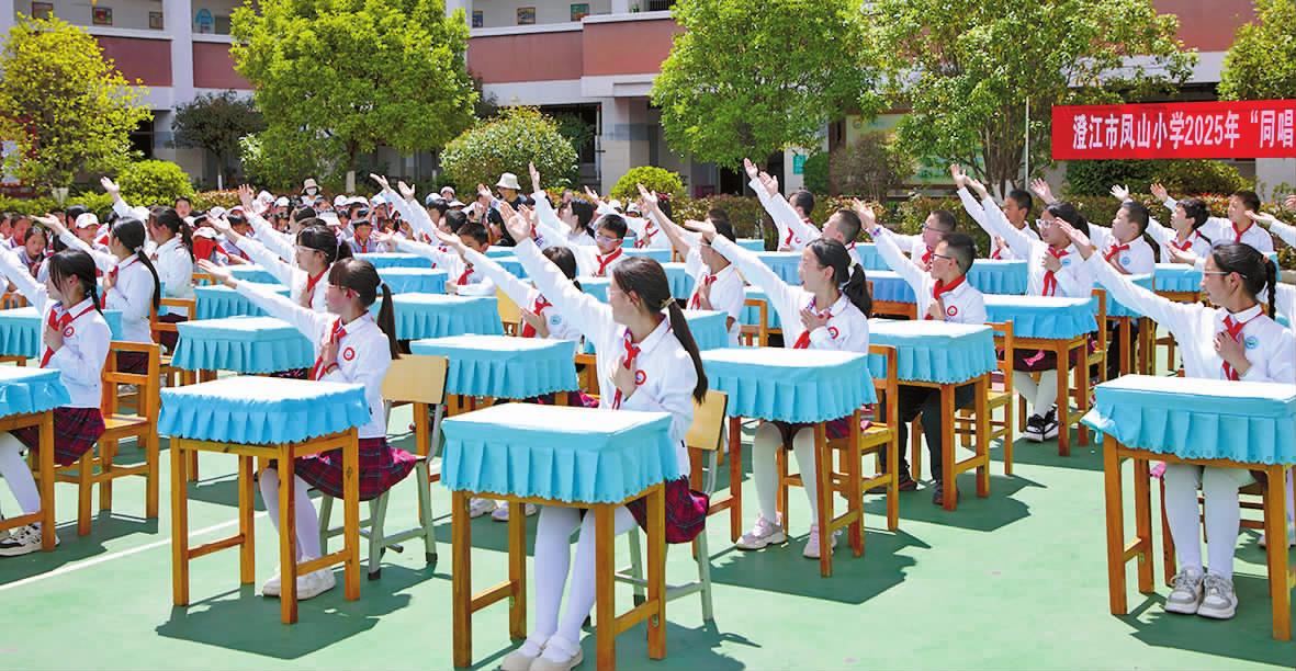 连日来,凤山小学开展主题为“同唱一首歌 同为一家人”的课桌舞大赛,以独特的方式抒发爱国之情,共筑团结之魂。比赛在激昂的音乐声中拉开帷幕,伴随欢快旋律,学生们整齐划一地舞动起来,动作或轻盈优美,或活力四射,小小的课桌成为大家展示自我的“舞台”。从流行曲目到经典戏曲,多样的音乐风格搭配着独具创意的舞蹈编排,充分激发学生德智体美劳全面发展的潜能。 通讯员 师颖 刘通 摄