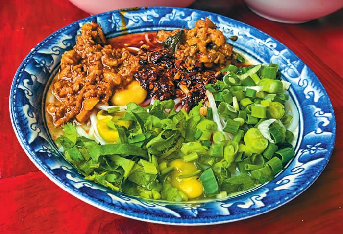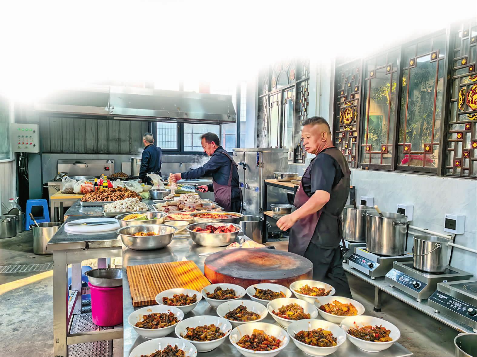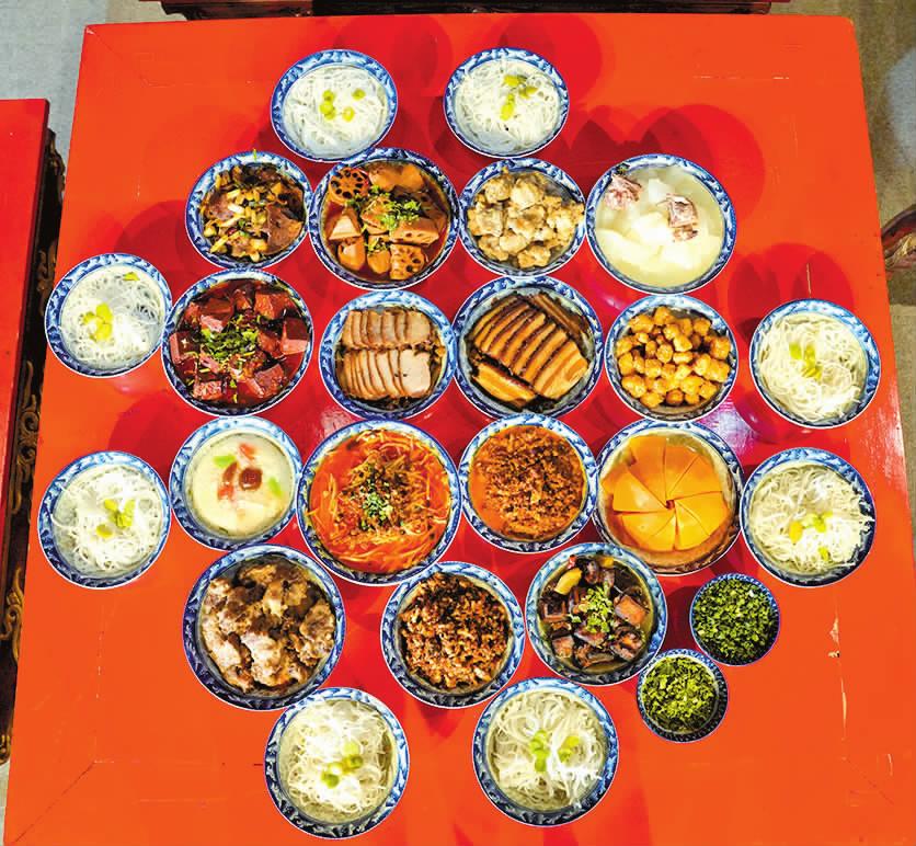 玉溪八大碗,天天米线节 四月末,记者来到位于大营街街道汇溪路与郭井路交叉口不远处的迎村味庄,采访了这里的负责人廖启斌。据介绍,旧时,八大碗是玉溪农村最好的宴席菜肴,在农村传统饮食文化中占有重要位置,也被称为“酥烧八大碗”,烹制方法多样,摆上桌,香味四溢,让人没吃就咂嘴,吃起来更过瘾,是老玉溪舌尖上抹不去的记忆。 廖启斌说:“其他地方也有八大碗,但与玉溪八大碗不同的就在于米线。我们的口号是‘玉溪八大碗,天天米线节’,因为历时九九八十一天的玉溪米线节是世界上最长的节日。我们的八大碗总共十六个菜,其中一碗是‘哇家米线’。米线是人手一碗,吃完可加,没有限量。这样的安排,既体现了玉溪八大碗的特色,又有了过米线节的仪式感。” 在八大碗中,传统的酥肉、千张肉等基本上是固定的,其他肉菜则根据四季食材而定,如用莴笋片或萝卜片垫底,油炸肉、熏肉、卤肝和卤肚切成块放上面,然后浇上料汁即成;豆韭肉丝,豆芽加韭菜加肉丝,口感新鲜;蒸红薯,其上点缀绿茴香,味道甘美;菠菜鲜肉汤,绿绿的菠菜枝叶、红红的根儿,还有白的肉丝漂在汤里,让人垂涎。 廖启斌说:“八大碗用的是地道的大土碗盛菜,而且所用食材绿色生态,香醇可口。八大碗寓意‘八仙过海,各显神通’,象征着吉祥如意,并且每一道菜都有其美好寓意,代表着人们对美好生活的朴素愿景。比如丸子外形圆润,有汤圆那么大,它的寓意是团圆美满;红烧肉呈方块状,代表火红喜庆;酥肉泡而柔软,寓意做人和气大方;肘子长宽各10多厘米,刚好够瓷碗装下,代表做事遵守规矩;凉拌泡皮,代表事业发达,圆满成功;千张肉寓意着千岁平安……”