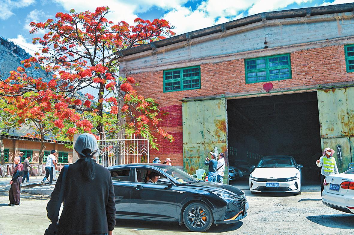 5月5日,在易门县绿汁镇原易门铜矿设备领用处,工作人员指挥游客车辆停入车间。为有效应对“五一”假期旅游热潮,营造良好的旅游环境,绿汁镇提前规划,清理废弃的3个车间供游客停放车辆。车间变身停车场,广大游客有序停车后,便能顺畅观赏凤凰花,参观易门铜矿工业遗迹。 本报记者 崔永红 摄