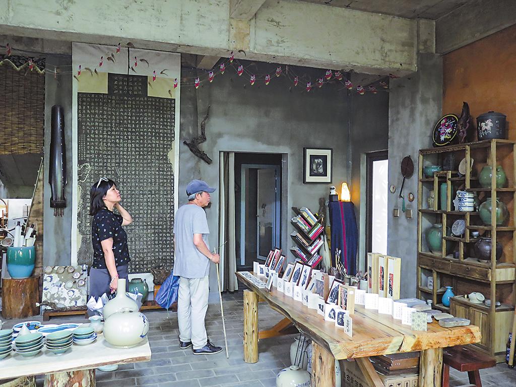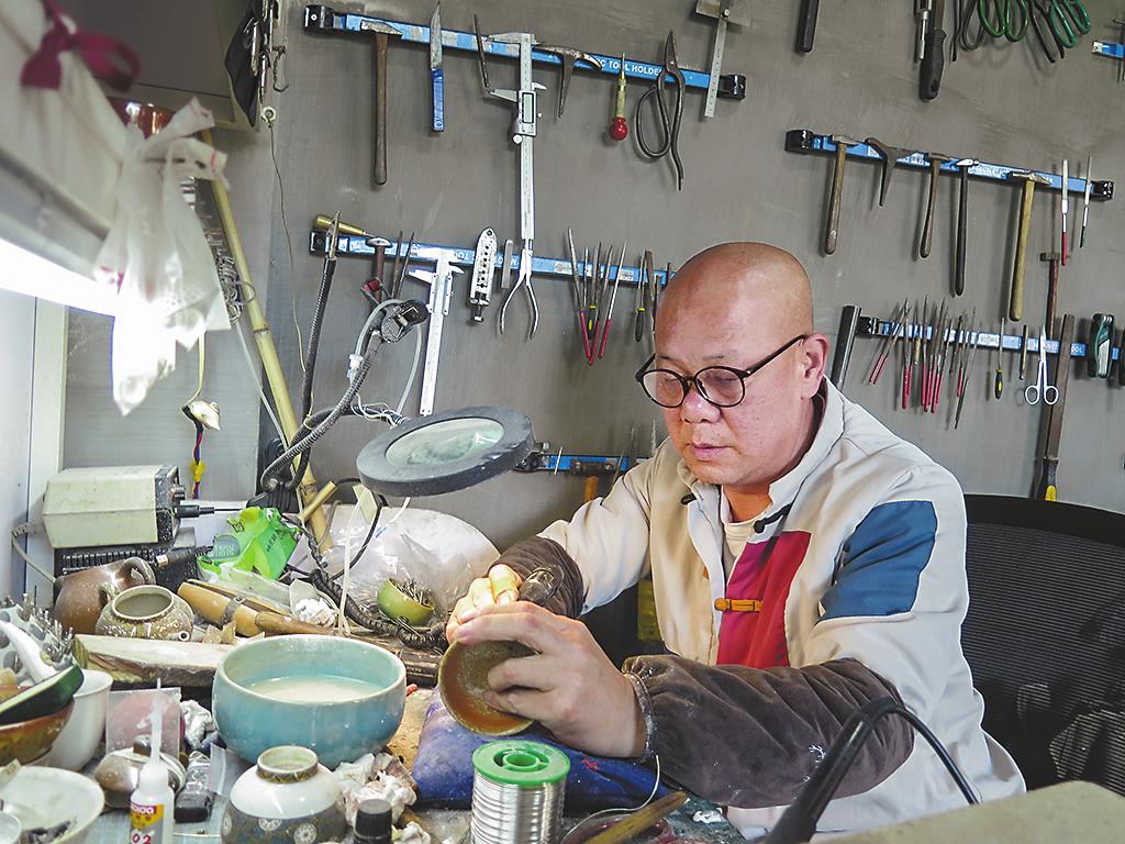 □ 本报记者 饶平 实习记者 唐诗淇 文/图 秋日的午后,记者来到华宁县冲麦村一座名为“映月居”的工作室,艺术家王海军正俯身案前,手持拓包,在覆于陶片的宣纸上轻轻拍打。墨色渐染,甲骨文体的“华宁陶”三个字在纸上清晰浮现。跨越千年的文化符号,在这个静谧的午后被重新唤醒。 他的工作台上陈列着锔瓷的金线、用于金缮的生漆以及待拓的古砖,让记者感觉走进了一座微型古代工坊。他的指尖抚过一张刚拓印好的宣纸,上面的古文字带着岁月的温度,清晰如昨。工作室里,陶器、石雕、金属工艺品与书画作品错落陈列,每一个角落都经过了主人的精心设计。在这里,没有废品,只有等待重生的艺术“精灵”。 扎根乡村,默默耕耘 在王海军的工作室里,“不作狂言宜吉利,多行好事自康祥”的对联,传递着主人质朴的生活愿望。墙上,字画与陶杯相映成趣,一幅由废旧拓片和名人字画拼合而成的锦灰堆作品格外引人注目。 “人生就是要活出多种样式。”王海军放下手中的拓包,笑容温和地对记者说。他曾在工程行业耕耘十余年,事业顺遂之时却毅然转身。“有人说我放弃积累多年的资源和关系太可惜,但我尝试活出多种样式的人生。”从王海军的话中听得出来,他骨子里的艺术情怀,如暗夜里的火种,从未熄灭。 这种对多样人生的追求,引领着他从大理来到华宁。2023年,锔瓷金缮修复手工艺大师王海军入驻冲麦村,他把锔瓷金缮修复工艺与华宁陶产业结合,推出了华宁陶系列文创产品,获得了很好的市场反响,帮助华宁陶进一步拓宽了市场和提升了知名度。2025年,玉溪师范学院美术学院民族民间工艺艺术科技小院在冲麦村揭牌,王海军被聘为美术学院的行业导师,为本科生、研究生提供创作指导和教学,确保学术与实践的深度融合。 “大理的冬天气温太低,而玉溪气候宜人,安静闲适,更适合创作。”他轻描淡写的背后,是对创作环境的极致考量。冲麦村传统建筑风貌保存完好,彝族风情浓郁,南方丝绸之路古驿道文化深厚……这些最终让他停下了迁徙的脚步。 来到冲麦村后,王海军有了自己的生活和工作节奏:一天中做陶、雕刻、外出寻石以及和村里人唠唠家长里短。有时又埋首古文字,钻研拓印技艺,设计原创产品,让艺术如溪水般自然淌进生活的肌理。