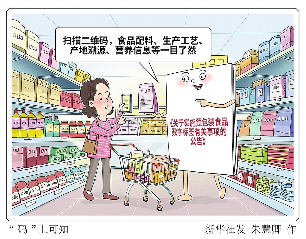 9月8日,国家卫生健康委、国家市场监督管理总局联合发布《关于实施预包装食品数字标签有关事项的公告》,我国预包装食品标签管理正式迈入数字化新阶段。 朱慧卿/作(新华社9月8日发)