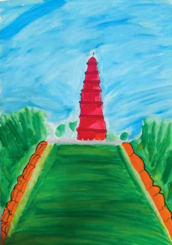 点评:小作者仔细观察,抓住红塔山的特点认真落笔,看似随意的着色却能精准显现出天空的晴朗、大草坪的绿意盎然和红塔的巍峨耸立。作品配色简单清爽,画面紧凑饱满,特色鲜明。