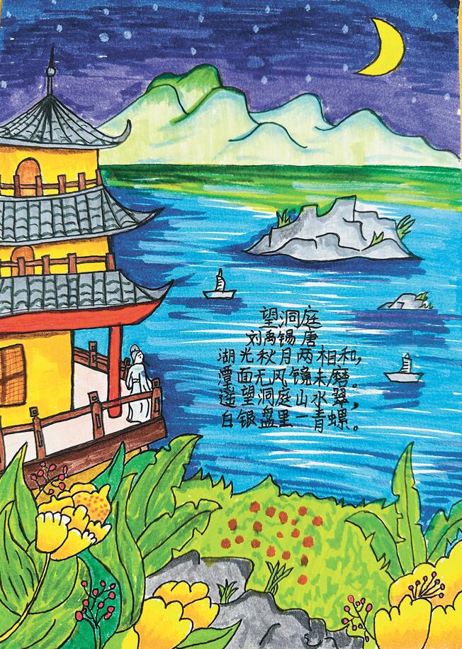 点评:这是一幅诗配画作品,小作者从古诗文字出发,通过描绘岳阳楼、君山岛、湖面、月光等关键元素,展现洞庭湖水月交融的静谧之景。作品笔调细腻轻盈,色彩和谐,细节丰富,意境悠远,诗画相融。